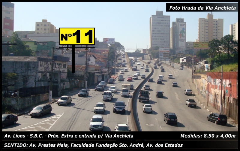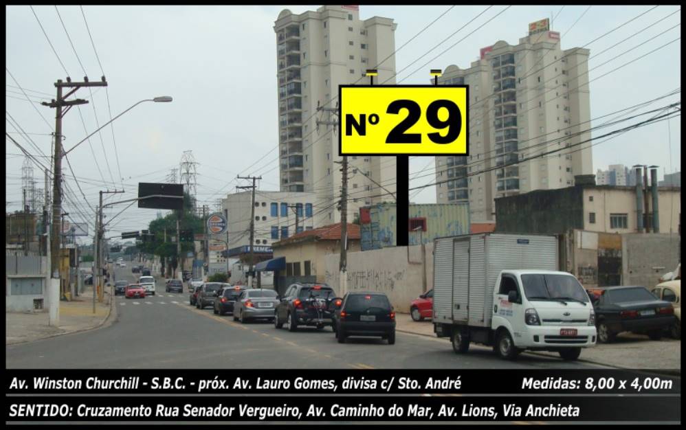 Veja os pontos de Placa publicitária em S.B.C. - Avenida João Firmino os clientes contam com duas opções de Front Light de 8,00 x 4,00; a Avenida Winston Churchill possui fluxo de mais de 30 mil veículos/dia e duas opções para Front Light de 8,00 x 4,00 m; na Avenida Lions; a Avenida Piraporinha; a Avenida Lucas Nogueira Garcêz; e na Avenida Pereira Barreto.